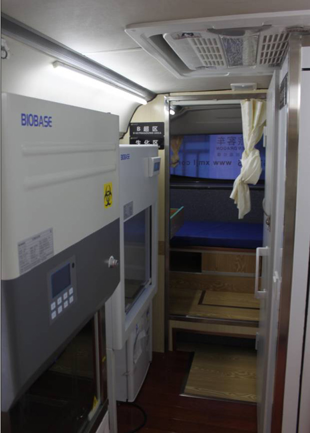 在正规的体检医疗车上,同时配备有心电图检查仪、检查床、冰柜、空调和紫外线消毒灯等一系列正常体检和急救所需的所有设备。因为其流动性强,在下乡医疗活动中起到了很关键的作用,对于某些经济不发达的地区,医疗条件较差,相关卫生部门可以组织免费体检一类的活动,大大方便了那些没有钱进行定期体检的人。车上有B超检测器、胸透等仪器,孕妇也能做些保险性的检查。体检医疗车分为几种,分别为全科体检车、妇女健康管理车和DR体检车。比较而言,前者是一把抓,中间一个是分特定对象的,而最后的是搭配有DR设备的体检车。